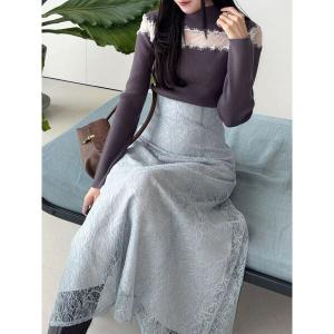 ワンピース カットレースブロッキングフレアスリーブマーメイドワンピース