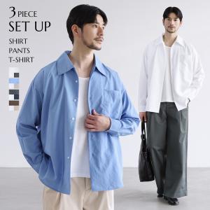 【3点セット】 セットアップ メンズ 春服 秋服 長袖 シャツ 半袖カットソー Tシャツ Uネック ライトツイル スラックス ワンタック ワイドシルエット 綿タッチ