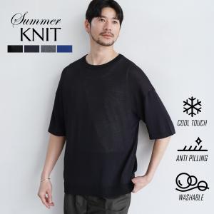 サマーニット ニット メンズ 春 夏 接触冷感 ピリング防止 ゆったり ウォッシャブル 透け感 クルーネック 半袖 5分袖 薄手
