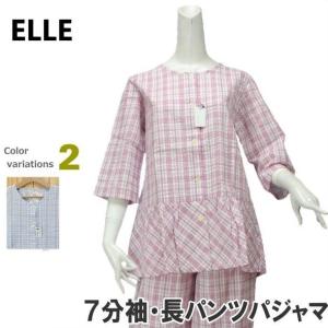 パジャマ レディース Lサイズ 春夏 7分袖・長パンツパジャマ ELLE エル レディース 綿100%サッカー地 丸首 前あき全開