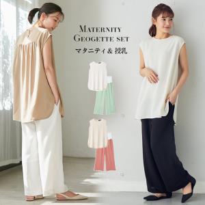マタニティトップス パンツ 授乳服 セット ストレッチ ジョーゼット フレンチスリーブ トップス ワイドパンツ 妊婦服 半袖 オフィス 通勤 仕事服 エンジェリーベ