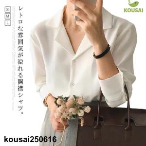 開襟 シャツ ブラウン 長袖 レディース レトロ トップス Vネック オープンカラー オフィス 事務服 お仕事 カジュアル 春 夏 秋