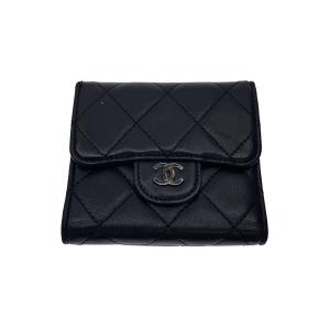 CHANEL◆2ツ折サイフ_マトラッセ_ラムスキン_Wホック_ココマーク_BLK/羊革/BLK/無地/レディース