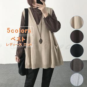 ニットベスト ロング丈 ニットトップス 重ね着 レディース ニット 無地 Vネック サイトポケット 体型カバー プルオーバー セーター ゆったり 大きめ