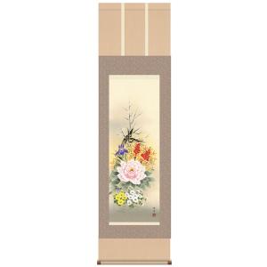 掛軸 掛け軸 花鳥画 年中飾り 四君子 洛彩緞子本表装 尺五 北山歩生 桐箱 h06-snk-kz5a1-111
