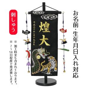 名前旗 男の子用 雲に龍虎 黒ジャガード刺しゅう (小) 鯉のぼりつるし 台付き