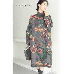 cawaii Sから3L対応 鮮やかな花を描いたあったかタートルネックミニワンピース