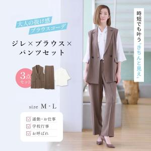 【洋服の青山】《最短当日発送》オールシーズン ブラウン 茶色 テーラードジレ&ブラウス&ワイドパンツセット 3点セット WEB限定 ジレ ダブル セットアップ