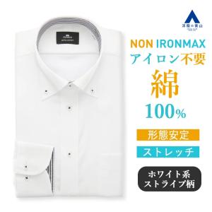 【洋服の青山】ノーアイロン 綿100% ワイシャツ 長袖 メンズ 春夏秋冬 ワボタンダウン ホワイト 白色 ストライプ柄 39cm 胸ポケット 形態安定 シワになりにくい