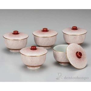 九谷焼 蓋付汲出揃 赤網 5個セット ( 退職祝い 定年 茶器セット 急須 湯呑み 日本茶 中国茶 九谷焼 結婚 出産 内祝い 引き出物 金婚式 誕生日プレゼント )
