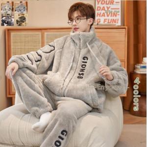 パジャマ メンズ 長袖 長ズボン 暖かい 防寒 保温 防風 前開き 冬 上下セット 無地 シンプル 紳士 男性 ふわふわ 部屋着 ルームウェア