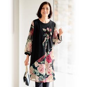 ワンピース きれいめ レディース 秋冬 50代 60代 70代 80代 ミセス シニア ファッション 百貨店通販販売商品 花モチーフ 異素材使い チュニック ワンピース