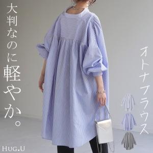 シャツ 映え ギャザー 体型カバー トップス レディース ストライプ チュニック スキッパー キーネック 長袖