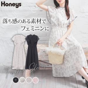 ワンピース 半袖 ロング丈 大きいサイズ フリル袖 ドット柄 花柄 ジョーゼ SALE Honeys ハニーズ フリル袖ワンピース
