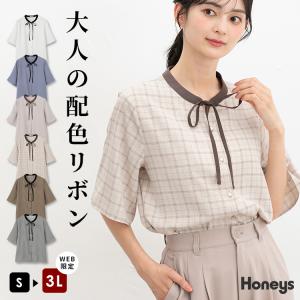 トップス ブラウス 半袖 大きいサイズ オフィス きれいめ リボンブラウス 配色ブラウス 再生ポリエステル レディース SALE Honeys ハニーズ 配色リボンブラウス