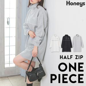 ワンピース 長袖 ミニ丈 ハーフジップ ロゴ 刺繍 綿混 ガーリー オールシーズン SALE Honeys ハニーズ ハーフジップワンピース