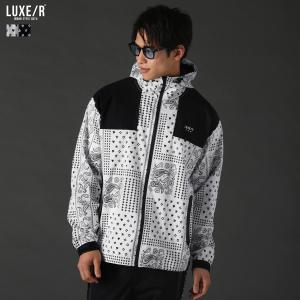 パーカー メンズ 春 春服 布帛 総柄 バンダナ ボリュームネック ハイネック ロゴ ブリント ゴルフ ジム 長袖 伸縮性 LUXE/R 45600
