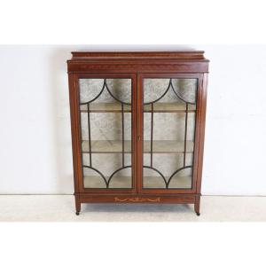 ce-32 1910年代イギリス製アンティーク エドワーディアン マホガニー ディスプレイキャビネット 象嵌細工 飾り棚 ショーケース 店舗什器 送料無料