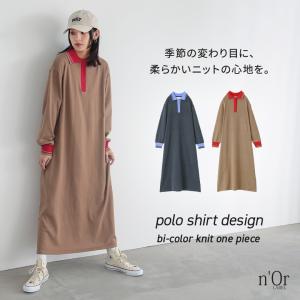 ワンピース レディース 長袖 ワンピ ニット ニットワンピ ポロシャツ風 配色ライン ボタン ロングシーズン「メール便不可」「30」
