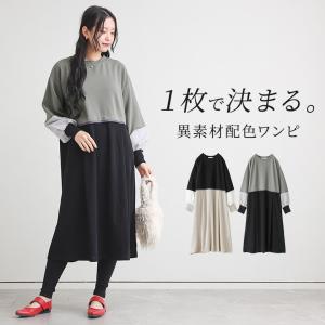 長袖ワンピース レディース ドレス 長袖 クルーネック 膝丈 ドッキング 異素材 配色 モノトーン 切り替え 秋 冬 オシャレウォーカー「メール便不可」「30」