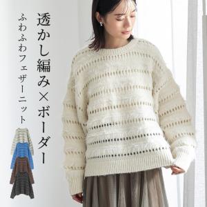 ニット レディース トップス ニットトップス 長袖ニット クルーネック フェザーニット 透かしボーダー 秋 冬 オシャレウォーカー「メール便不可」「30」