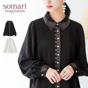 シャツ ブラウス レディース トップス 長袖 襟付き 刺繍 花柄 ボタン フェイクパール スカラップ 配色 バイカラー「メール便可」「10」