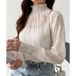 ブラウス シャツ 透け感で華やぐ洗練シアー シャーリング シアーブラウス プリーツ ブラウス ハイネック シアートップス 長袖 オケージョン オフィス