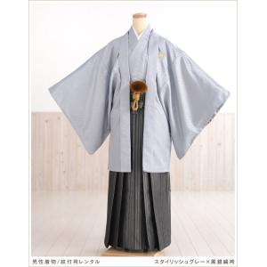 卒業式 袴レンタル 男 mo062-4 羽織袴レンタル 〔スタイリッシュグレー×黒銀縞袴〕/紋付きフルセット 人気 メンズ 結婚式 イベント