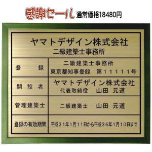 二級建築士事務所登録票 【真鍮プレート グリーン色額入り】おしゃれな二級建築士事務所登録票