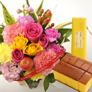 花とスイーツのセット バラアレンジメントと 長崎カステラ蜂蜜 0.5号 10切入 誕生日 記念日 お祝い花 即日発送 あすつく プレゼント お取り寄せ FKAA