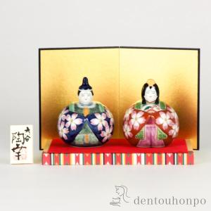 名入れ木札無料 九谷焼 玉雛人形 紺赤桜紋 3号 台・敷物・屏風・木札付 ( コンパクト お雛様 ひな人形 陶器 木札 ミニ 九谷焼 雛の節句 桃の節句 プレゼント )