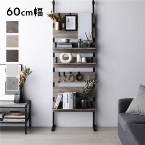突っ張り ウォールラック 〔 60cm幅 グレージュ×ブラック 〕 ミラー付き 壁面収納 棚 賃貸OK 組立品
