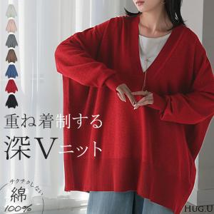 ニット Vネック レイヤード レディース 深V リブニット ライトニット セーター カットソー 袖リブ 綿100%