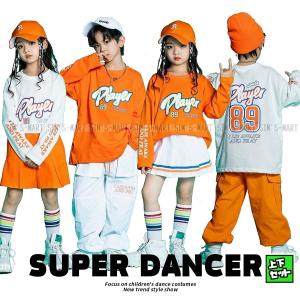 キッズダンス衣装 セットアップ ガールズ ヒップホップ 男の子 ダンス衣装 派手 K-POP 韓国 オレンジ 白 バックプリント