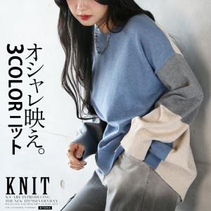 トップス ニット配色 切り替え 長袖 アシンメトリー ゆったり オシャレ映え3COLOR 配色切り替えニットブルー アイボリー グレー OTONA 40代 50代 60代