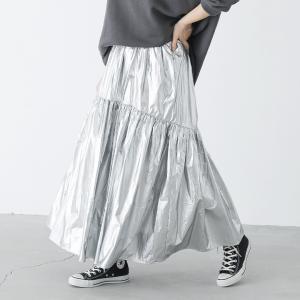 スカート ロング ゴム フレア ボトムス レディース メタリック シルバー ギャザー 春 オシャレウォーカー「メール便不可」「20」