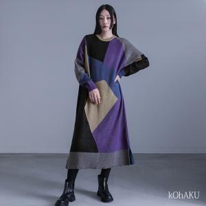 ニットワンピース ロング レディース 秋冬 長袖 クルーネック 配色 切替 ジャガード アシメ マルチカラー【メール便不可】【30】