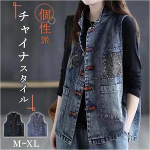 デニムベスト レディース 通販 チャイナ風 トップス デニム ベスト アウター 羽織りもの デニム生地トップス 重ね着 レイヤード 前開きベスト おしゃれ