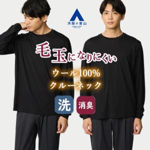 【洋服の青山】洗える ウール100% クルーネック Tシャツ 長袖 メンズ 秋冬 ブラック 黒 無地 杢調 大きいサイズ 丸首 ニットTシャツ 毛玉になりにくい 暖かい