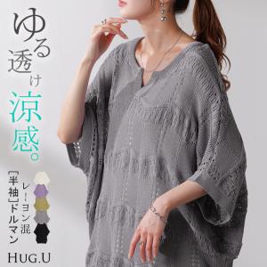 ニット 透かし編み レディース トップス セーター オーバー メッシュ プルオーバー ロング 半袖 長い ドルマン
