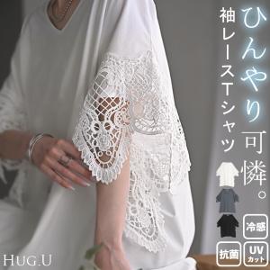 Tシャツ レース UVカット 接触冷感 レディース トップス 半袖 カットソー ロング ティーシャツ 抗菌 防臭
