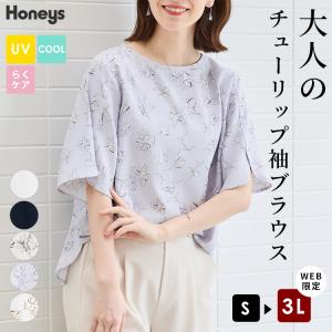 トップス ブラウス 半袖 ハニさら 大きいサイズ オフィス きれいめ UVカッ SALE Honeys ハニーズ チューリップ袖ブラウス