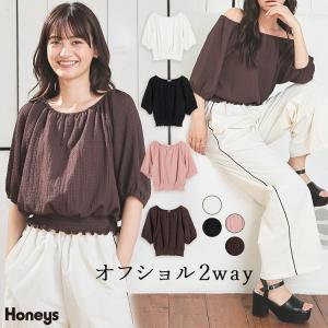 トップス カットソー 半袖 オフショルダー ボートネック 2way 裾シャーリング ボリューム袖 無地 レディース SALE Honeys ハニーズ オフショル2wayトップス