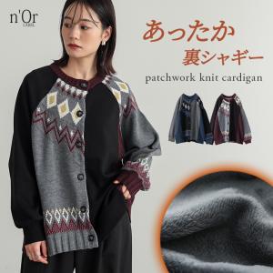 カーディガン 裏シャギー あったか レディース トップス ニット 長袖 アシンメトリー パッチワーク ノルディック柄 ケーブルニット 秋 冬「メール便不可」「30」