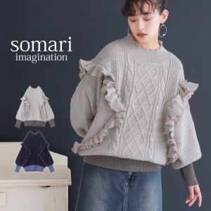 ニット レディース 秋冬 トップス セーター 長袖 ぽわん袖 リブ 配色 フリル ケーブルニット メロー「メール便不可」「30」