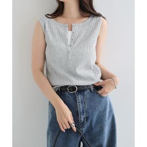 タンクトップ ノースリーブ セルフカットリブヘンリーネックノースリーブトップス レディース