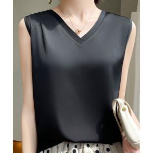 タンクトップ ノースリーブ 「艶感ただようサテン風」デコルテキレイ見せ Vネック タンクトップ レディース レディース
