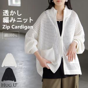 カーディガン 綿100% 透かし編み トップス レディース サマーニット ダブルジップ 羽織り ニット コットン チクチクしない 長袖 透け感 体型カバー ゆったり