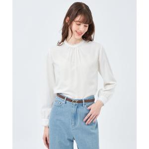 ブラウス シャツ 洗える ストレッチ | スリットパールスタンドカラーブラウス | 長袖 トップス 体型カバー オフィスカジュアル パフスリーブ パ