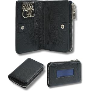 キーケース カード入れ付き ミニ財布 マルチケース スマートキーケース 本革 4連フック付き コンパクト 人気 便利 多機能 (ブラック)